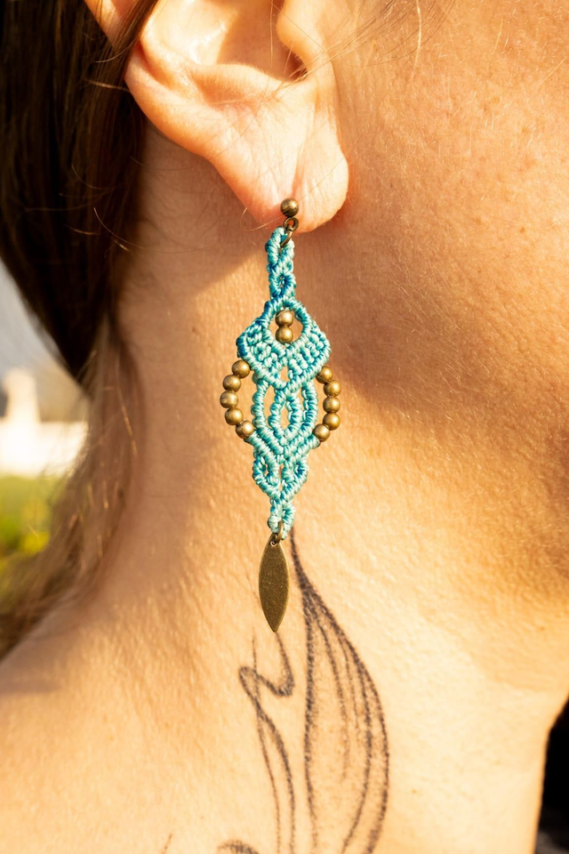 Boucles d'oreilles en micro-macramé en Fil Linhasita bleu Turquoise avec ses petites perles en argent vieilli et pendentif.