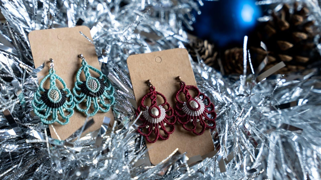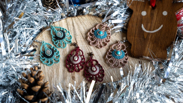 Boucles d'oreilles en micro-macramé en Fil Linhasita Bordeaux et beige. Perles argentées.