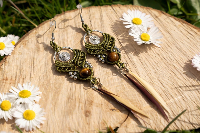 Boucles d'oreilles en micro-macramé en Fil Linhasita kaki avec ses jolies perles Oeil de Tigre et plumes.