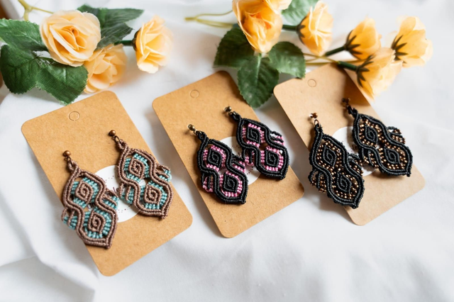 Boucles d'oreilles en micro-macramé noir et perles cuivrés