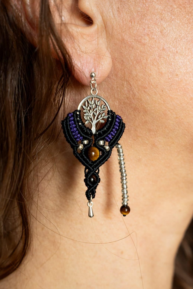 Boucles d'oreilles en micro-macramé noir et violet, perles Oeil de Tigre et perles rocailles argentées. Pendentif Arbre de vie en acier argenté.