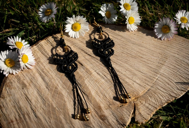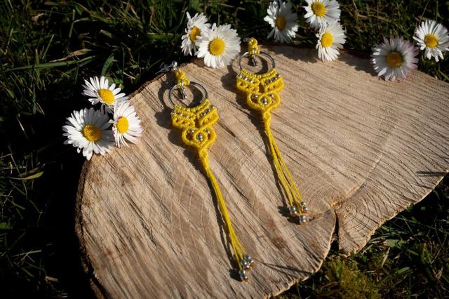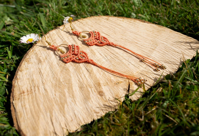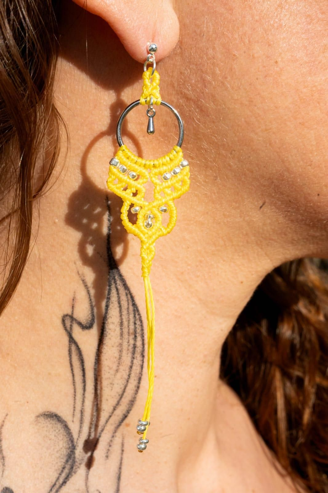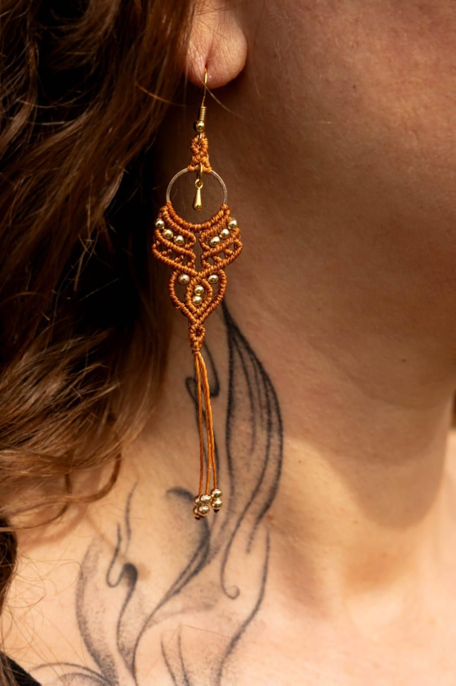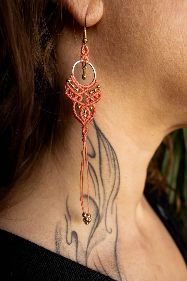 Jolie paire de boucles d'oreilles en micro-macramé Fil Linhasita différentes couleurs et perles de verre dorée ou argentée.