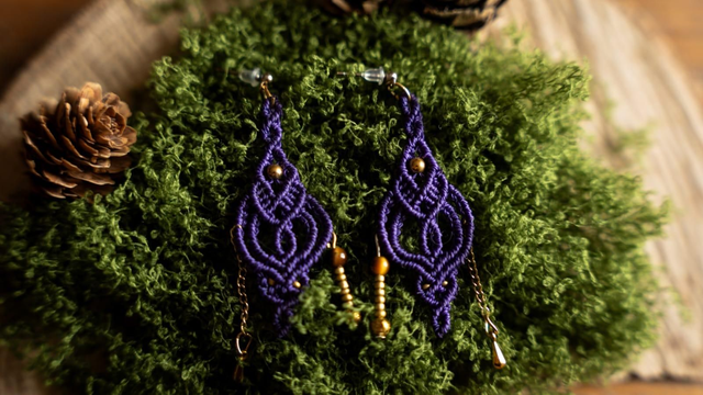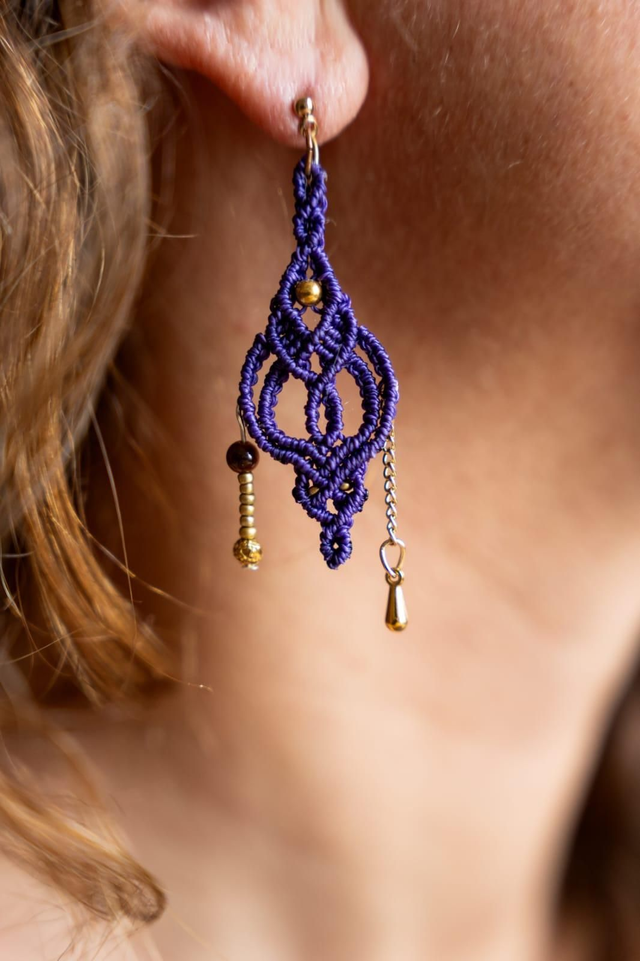 Boucles d'oreilles en micro-macramé en Fil Linhasita violet avec ses jolies perles de rocaille dorées. Chaînette et pendentif dorée. Perles Oeil de Tigre.