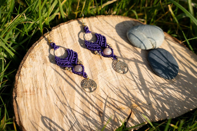 Boucles d'oreilles en micro-macramé violet, perle Pierre de Lune et estampe Arbre de vie