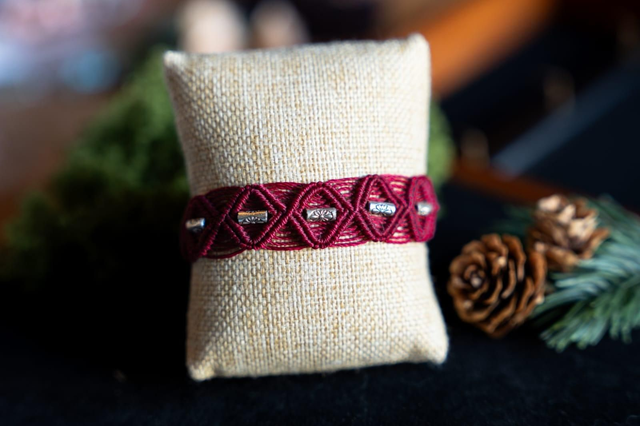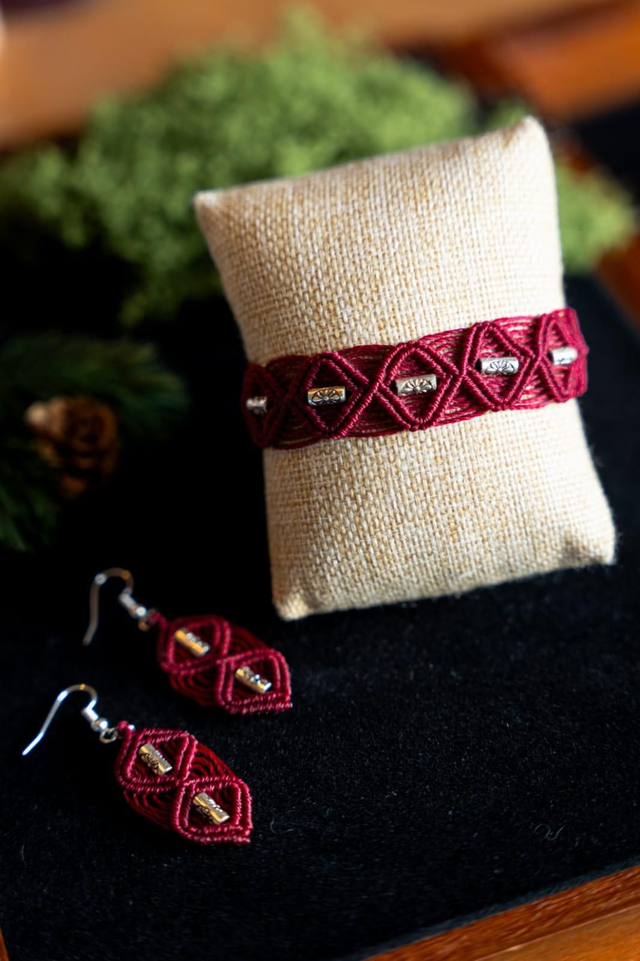 Bracelet en micro-macramé Fil Linhasita Bordeaux et perles argentées.
