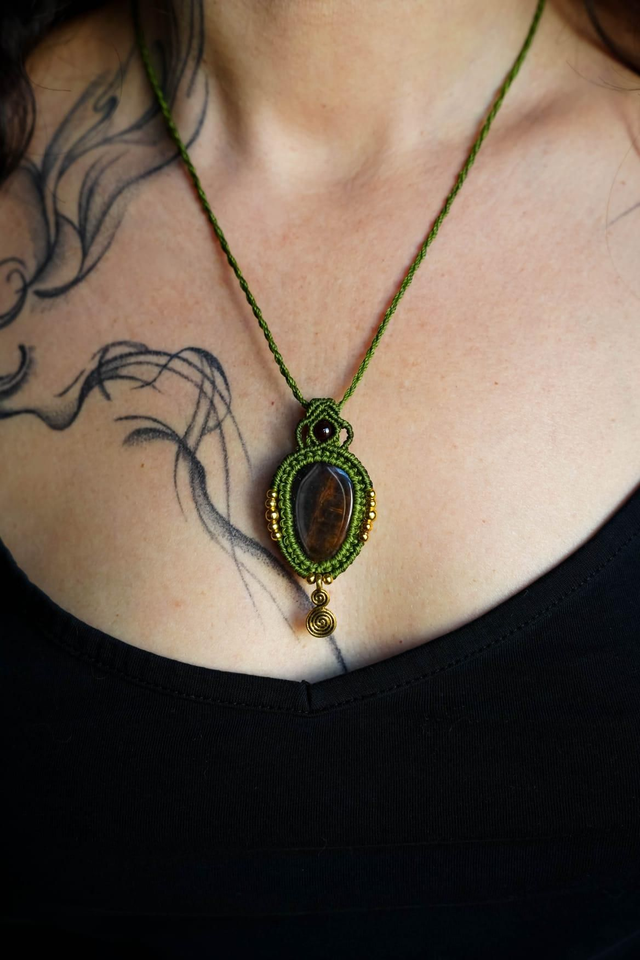 Collier en micro-macramé couleur kaki avec pierre Oeil de tigre
