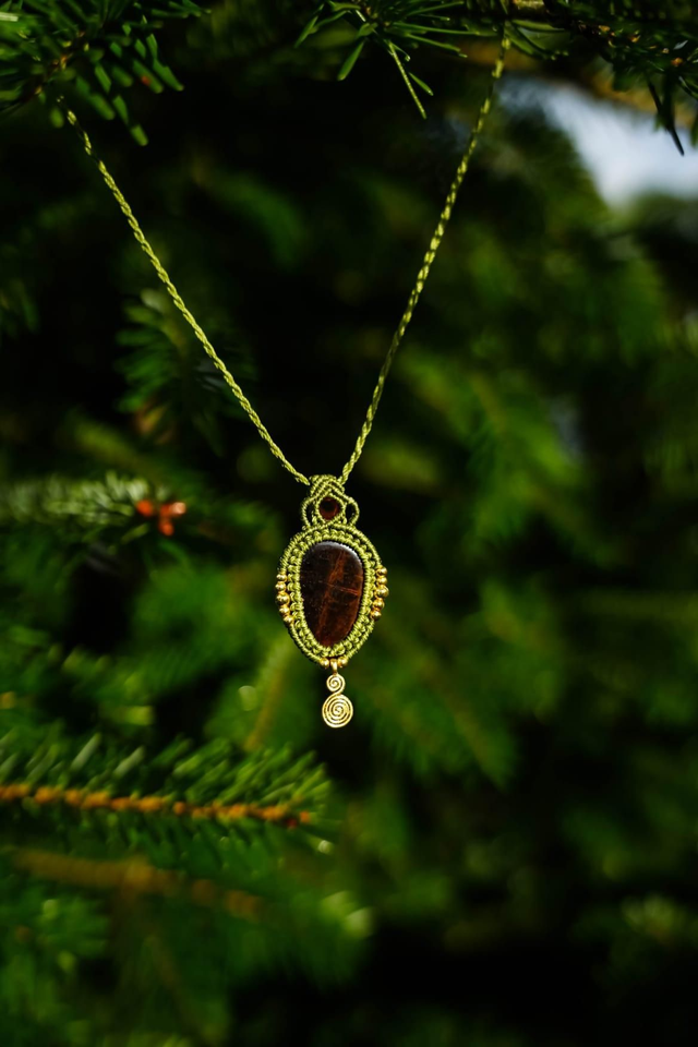 Joli collier simple mais délicat en micro-macramé couleur kaki avec sa jolie pierre Oeil de Tigre.
