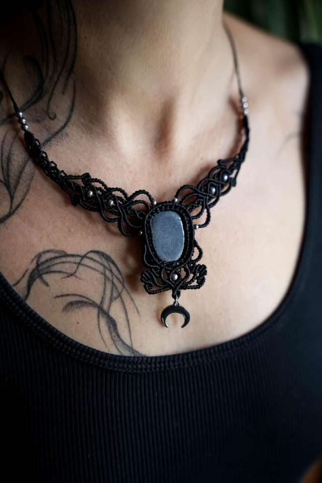 Joli collier en micro-macramé couleur noir avec pierre Hématite.