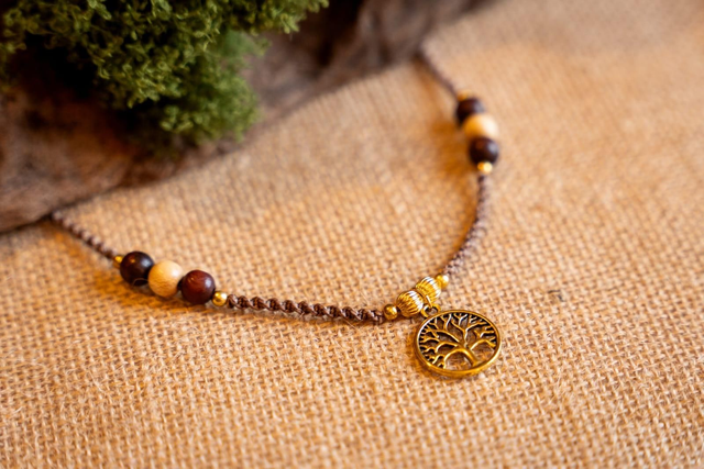 Joli collier en micro-macramé en fil Linhasita marron avec son joli Pendentif dorée Arbre de vie.
