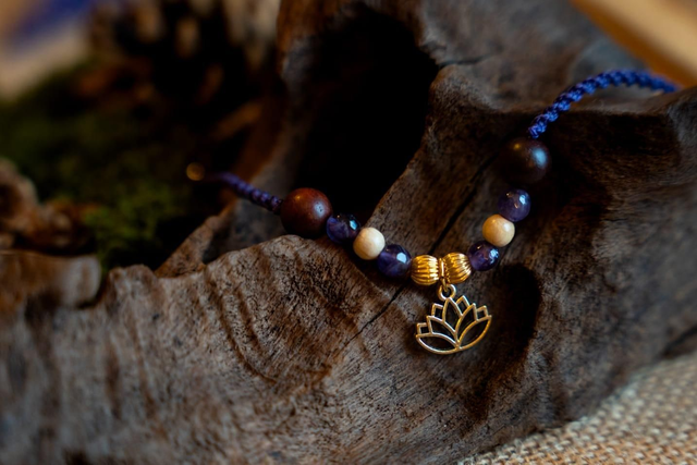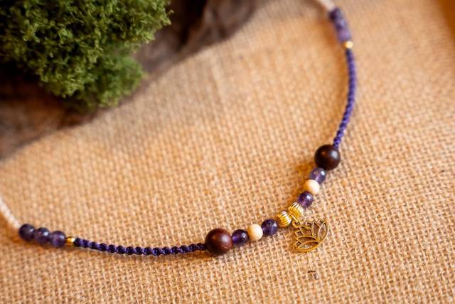 Joli collier en micro-macramé violet avec ses perles Améthyste, bois de rose, dorées. Pendentif dorée Fleur de Lotus.