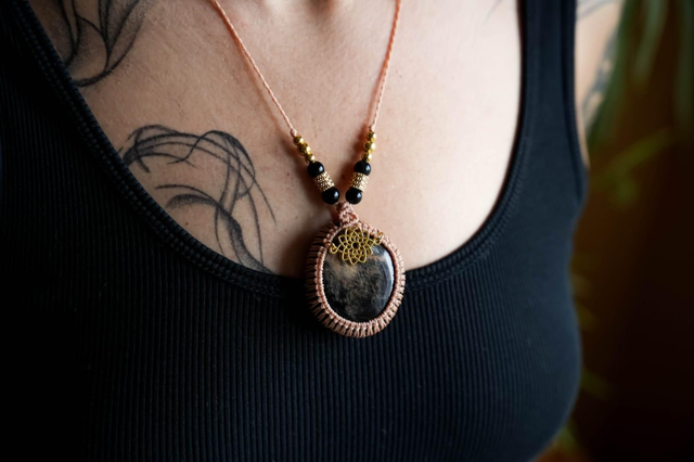 Joli collier long en micro-macramé couleur beige avec pierre "Pierre de soleil noire" et obsidienne noire.