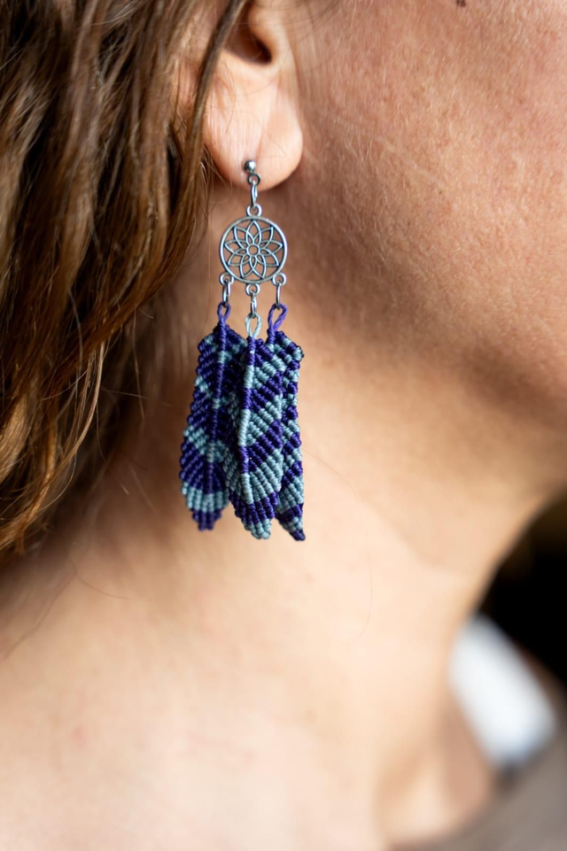 Voici une paire de boucles d'oreilles originale en forme de plume en micro-macramé Fil Linhasita bleu gris et violet avec son support en acier inoxydable.