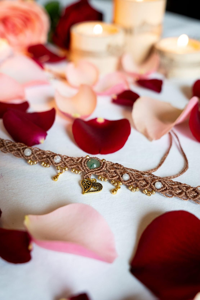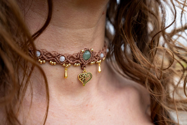 Ras de cou en micro-macramé Fil Linhasita noisette avec ses jolies perles Pierre de Lune et Aventurine. Pendentif coeur arabesque en métal doré.