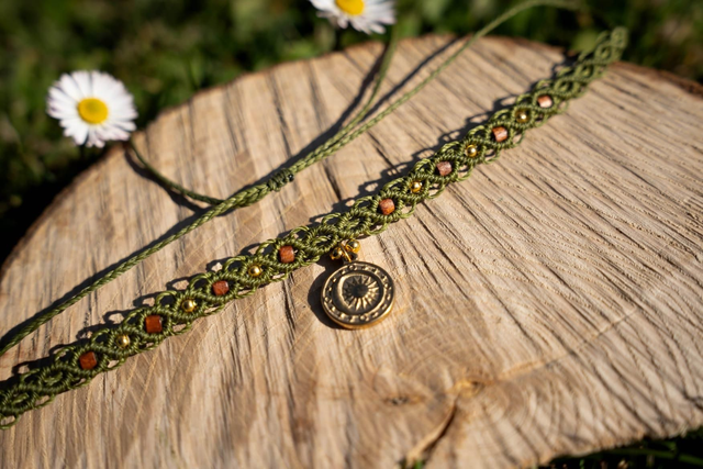 Ras de cou en micro-macramé Fil Linhasita kaki avec son joli Pendentif soleil doré.