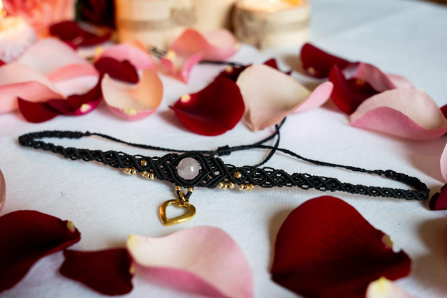Ras de cou en micro-macramé Fil Linhasita noir avec son joli Pendentif coeur en métal doré et perles Quartz Rose.