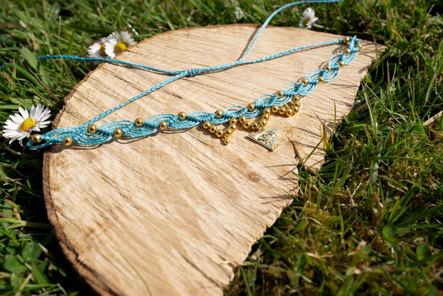 Ras de cou en micro-macramé Fil Linhasita turquoise avec son joli Pendentif Oeil de protection doré.