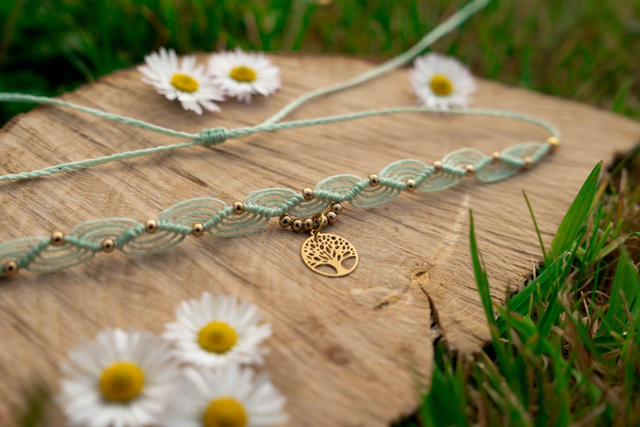 Ras de cou en micro-macramé Fil Linhasita vert clair avec son joli Pendentif Arbre de vie doré.